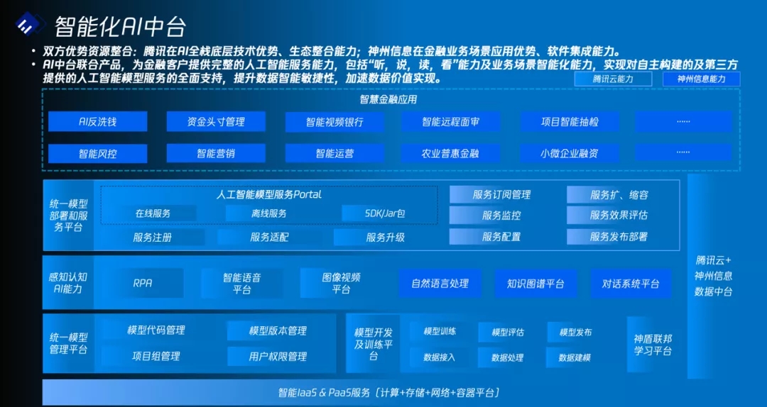 AI中台联合方案将结合腾讯在智能语音、智能图像、RPA、多方安全计算/联邦学习、数据标注、人工智能建模平台等全栈人工智能底层技术优势和神州信息在自然语言处理、知识图谱、对话系统方面的感知认知AI能力及在智能风控、智能营销、智能运营、普惠金融、AI反洗钱、智能视频银行、智能面审等人工智能应用场景丰富的落地经验,为金融行业用户提供完整一站式的人工智能服务能力,帮助金融行业用户实现“听,说,读,看”的人工智能能力,同时通过数据标注能力、数据挖掘建模和模型服务能力,方便金融行业用户实现人工智能相关模型及应用的自主构建,进而提升数据智能的敏捷性,加速数据价值变现。